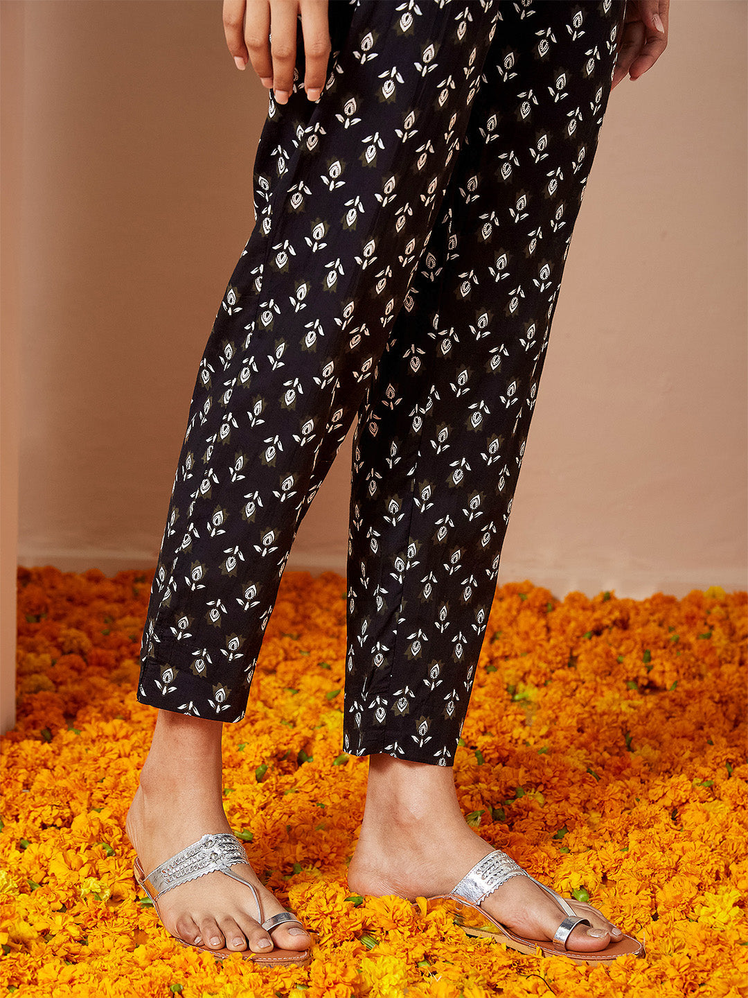 - Add a touch of timeless grace with this black anarkali kurta set from Janasya. Made from breathable cotton fabric, the kurta features a notch neckline with a band collar. The floral print adds elegance, while gota patti lace on the hem and three-quarter sleeves uplifts the festive vibe. A functional side pocket adds convenience. Paired with a matching narrow-fit floral printed pant with side slits and a semi-elasticated waist for comfort. The look is completed with a printed cotton dupatta featuring bold florals. Pair with oxidised silver jhumkas and a choker for a heritage-inspired look.