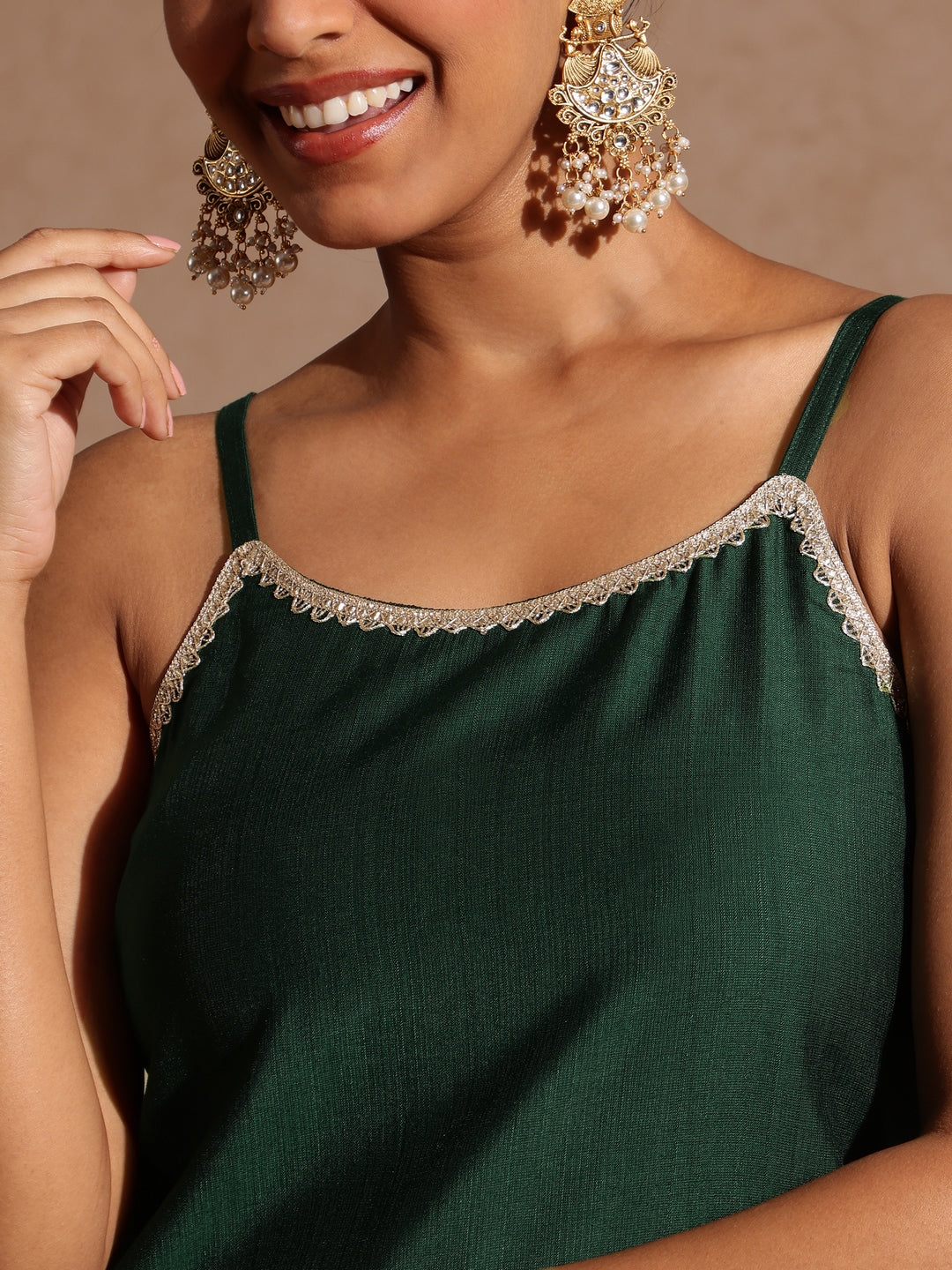- Turn heads in this bottle green straight kurta set from Janasya, crafted in a luxurious silk blend fabric. Featuring a round neckline trimmed with delicate gold lace, the sleeveless kurta is styled with slim straps for a contemporary touch. The straps are adjustable to ensure the perfect fit. Paired with matching narrow pants, designed with a semi-elasticated waist for comfort and ease and a side pocket for functionality. The highlight is the organza dupatta adorned with elegant gold zari threadwork in scattered floral vines, and a delicate touch of sequins adds the right amount of shimmer to the ensemble. Complete the look with statement chandbalis and a cocktail ring.