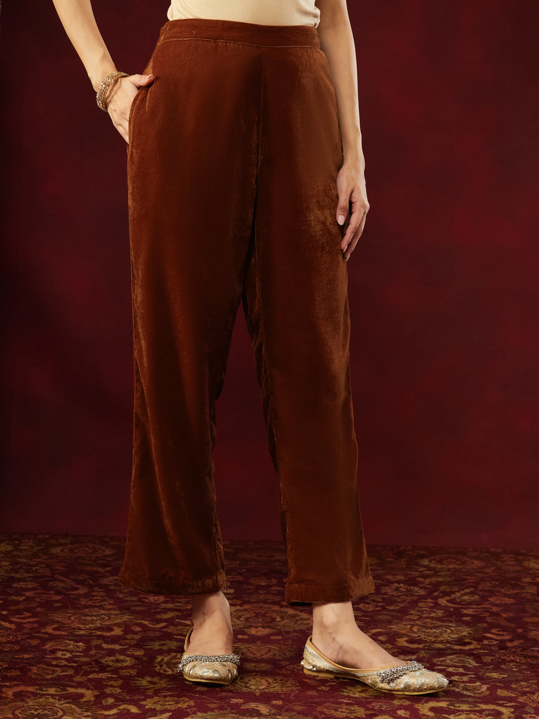 - Infuse the regal charm to your festive wardrobe with this luxurious brown velvet straight kurta set from janasya. Crafted in plush velvet, the kurta features a striking notch neckline adorned with intricate golden lace detailing that extends in layered panels down the yoke, creating an opulent focal point. The full-length sleeves are finished with delicate golden lace at the cuffs, adding to its regal charm. The kurta is paired with matching solid brown straight pants featuring a semi-elasticated waist for comfort and a practical side pocket. The look is completed with a rich brown silk blend dupatta, accentuated with golden lace along the edges for a festive flair. Style it with traditional gold jhumkas, a statement ring, and embellished mojaris to make a graceful impression at weddings and special occasions.