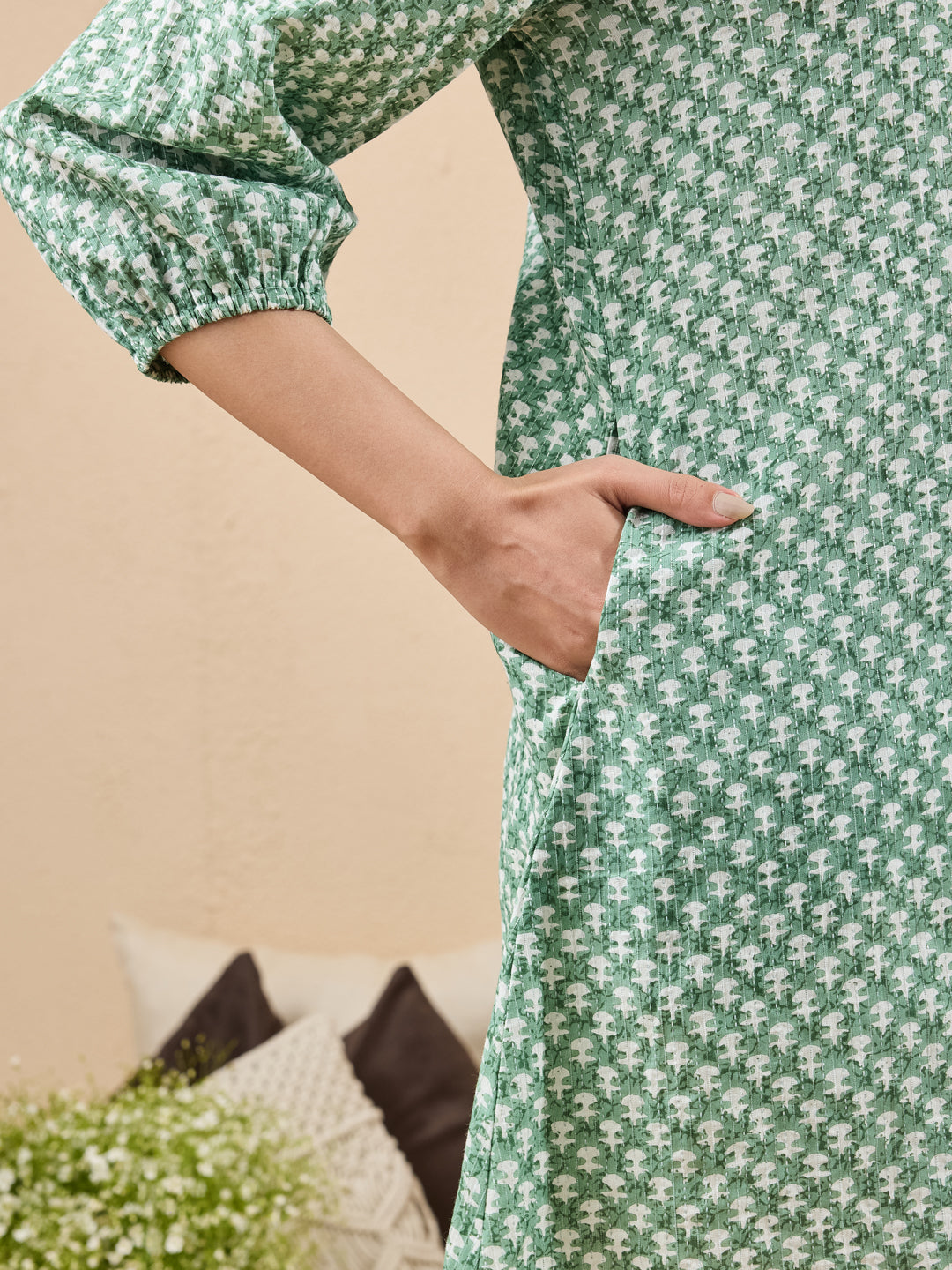 - Refresh your everyday wardrobe with this green cotton tunic from janasya, crafted in soft, breathable fabric for all-day comfort. Designed with a smart shirt collar and flattering v-neckline, it features three-quarter sleeves and a relaxed, easy silhouette. The ethnic-inspired print is enhanced with subtle kantha-style detailing, adding handcrafted charm and visual depth to the design. Versatile and effortless, this tunic is ideal for workdays or casual outings. Style it with slim-fit pants or leggings, oxidised silver earrings, and juttis or flats for a refined ethnic look.