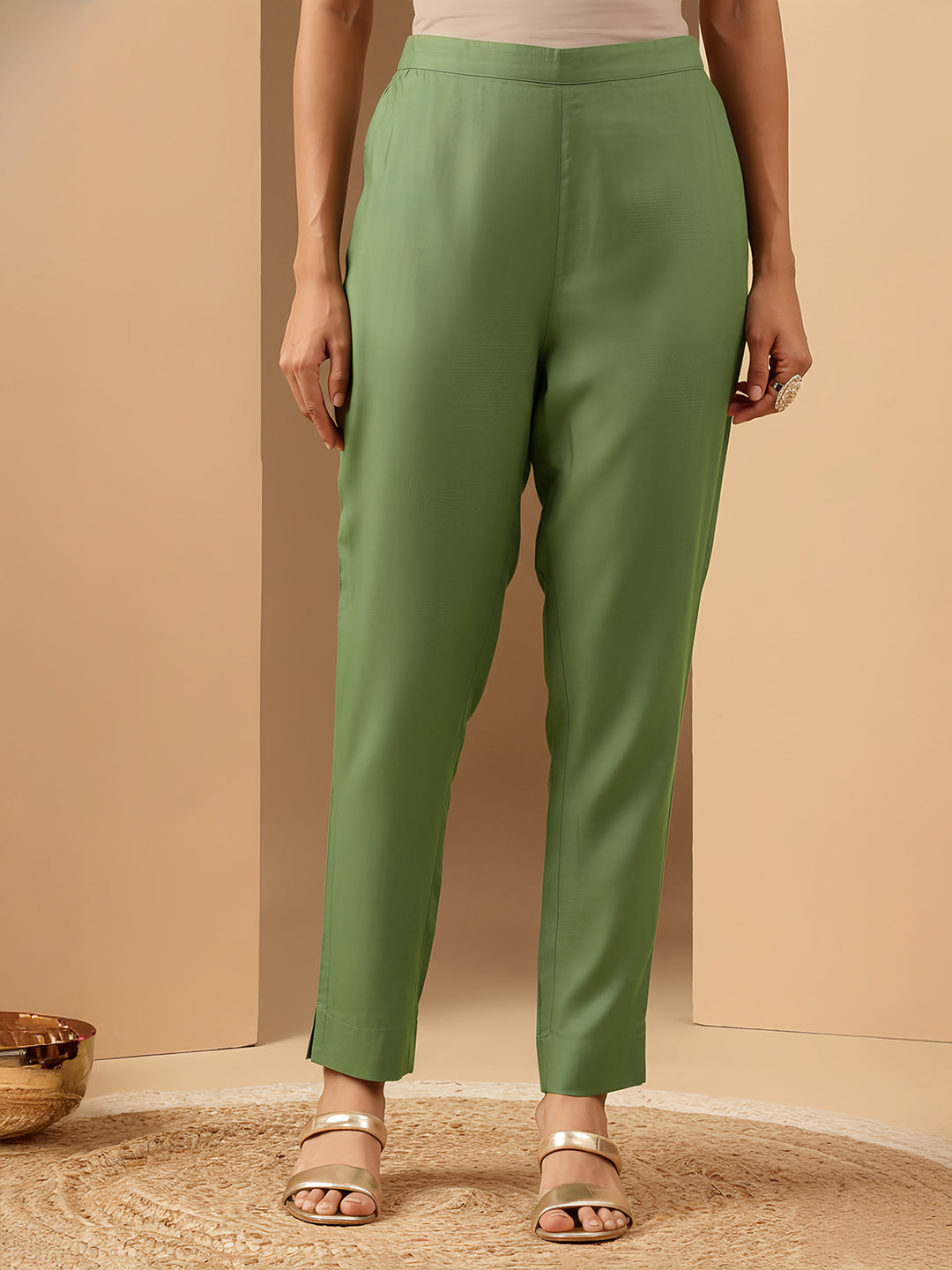 - Elevate your festive wardrobe with this graceful mint green green color silk blend kurta set from janasya. The straight-fit kurta is adorned with delicate floral foil print motifs spread evenly across the front, bringing a subtle shimmer to your look. A round notch neckline is accentuated with golden lace detailing, mirrored at the hem of the three-quarter sleeves, adding an elegant finish. The kurta is paired with a solid mint green color narrow pant crafted from matching silk blend fabric, designed with a semi-elasticated waist for a comfortable fit. Completing the ensemble is a luxurious jacquard dupatta featuring woven zari stripe-like motifs and a hint of sequin work, offering a festive glimmer. Style this look with statement jhumkas, a gold-toned clutch, and embellished mojris to shine at any celebration. This set strikes the perfect balance between traditional aesthetics and modern charm, making it a must-have for your ethnic collection.