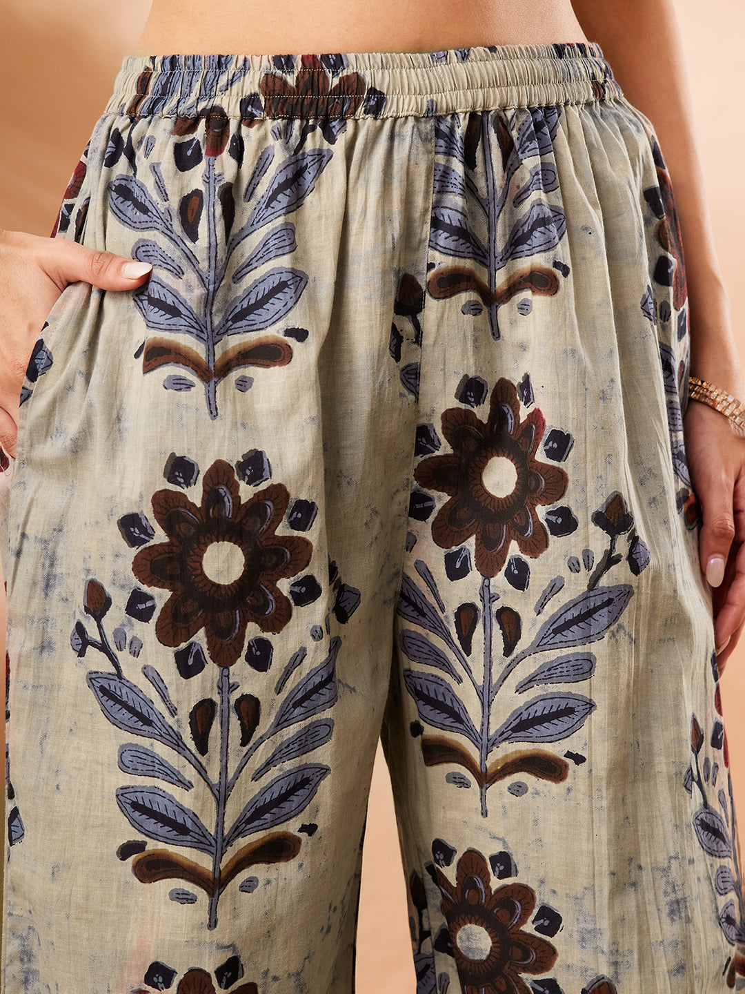 - Update your everyday ethnic style with this multicolour floral printed cotton co-ord set from janasya. The kurta features a smart band collar with a flattering v-neckline, wooden button detailing and comfortable regular sleeves. Paired with matching straight-fit cotton pants designed with a functional side pocket, this set offers breathable comfort and easy movement. Perfect for work or casual outings, style it with kolhapuri flats, oxidised earrings and a structured sling bag for an effortlessly chic look.