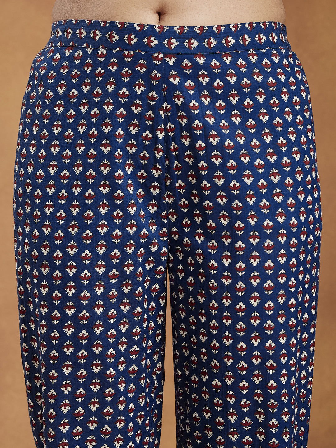 - Make a bold ethnic statement in this blue pure cotton floral printed anarkali set from janasya. Featuring a graceful anarkali silhouette along with the round neck adorned with delicate zari, sequin, and silver lace detailing, the kurta showcases all-over floral prints. It comes with three-quarter sleeves with silver gota patti lace on hem and a convenient side pocket for functionality. Paired with a matching printed pure cotton narrow pant, a contrasting solid maroon chiffon dupatta adding a vibrant pop of color and a matching printed scrunchie, the ensemble is both stylish and comfortable. Perfect for festive gatherings or celebrations, this set blends tradition with a touch of modern elegance.