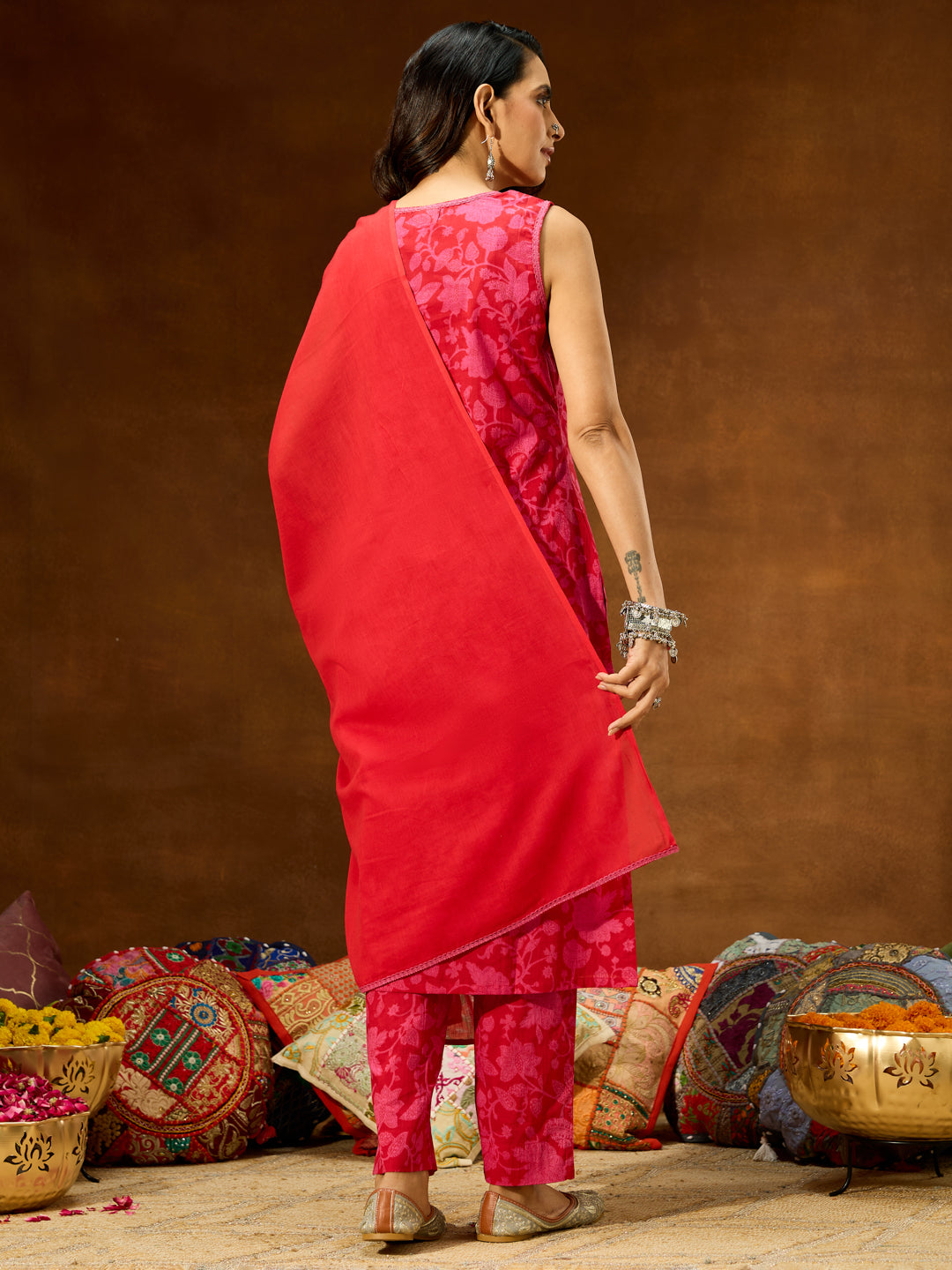 - Refresh your ethnic wardrobe with this elegant pink straight kurta set from Janasya. Crafted in soft cotton, the sleeveless kurta features a flattering round neckline enhanced with delicate lace and all-over floral print that adds a vibrant touch. The calf-length silhouette ensures a comfortable yet graceful fit. It is paired with a matching floral printed narrow pant featuring a semi-elasticated waist, side slit, and functional pocket for added ease. Completing the look is a solid pink cotton dupatta with lace detailing for a refined finish. Style this outfit with oxidized silver hoops and a delicate charm bracelet for a breezy, chic ethnic look.