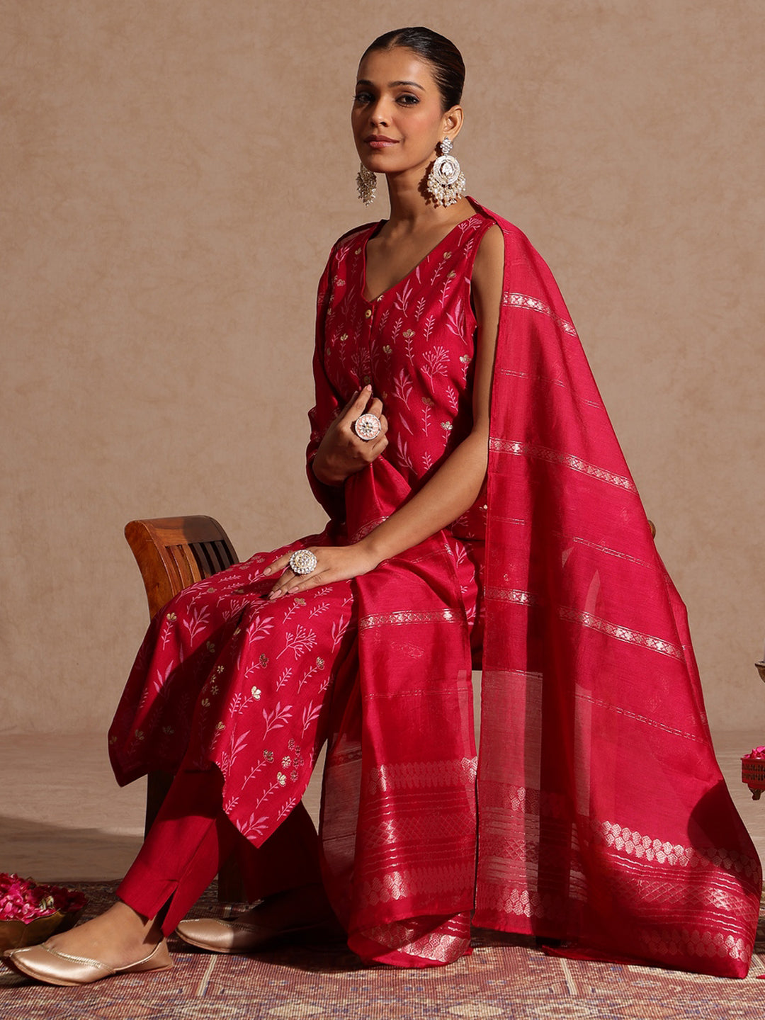 - Step into effortless festive charm with this stunning pink silk blend kurta set from Janasya. The sleeveless straight kurta features a flattering curved v-neckline and is adorned with delicate botanical foil prints in floral and leafy motifs across the front panel. Gold-toned buttons on the yoke and a front slit add contemporary flair and enhance the festive elegance. Tailored in a straight silhouette, this kurta brings together tradition and style with a modern twist. The ensemble is paired with a solid pink narrow pant featuring a semi-elasticated waistband for all-day comfort. Completing the look is a rich jacquard dupatta, crafted in a matching pink tone and embellished with strip-like zari woven motifs and subtle sequins, adding graceful shimmer. Accessorize this look with statement jhumkas, metallic kolhapuris, and a sleek ponytail or bun.
