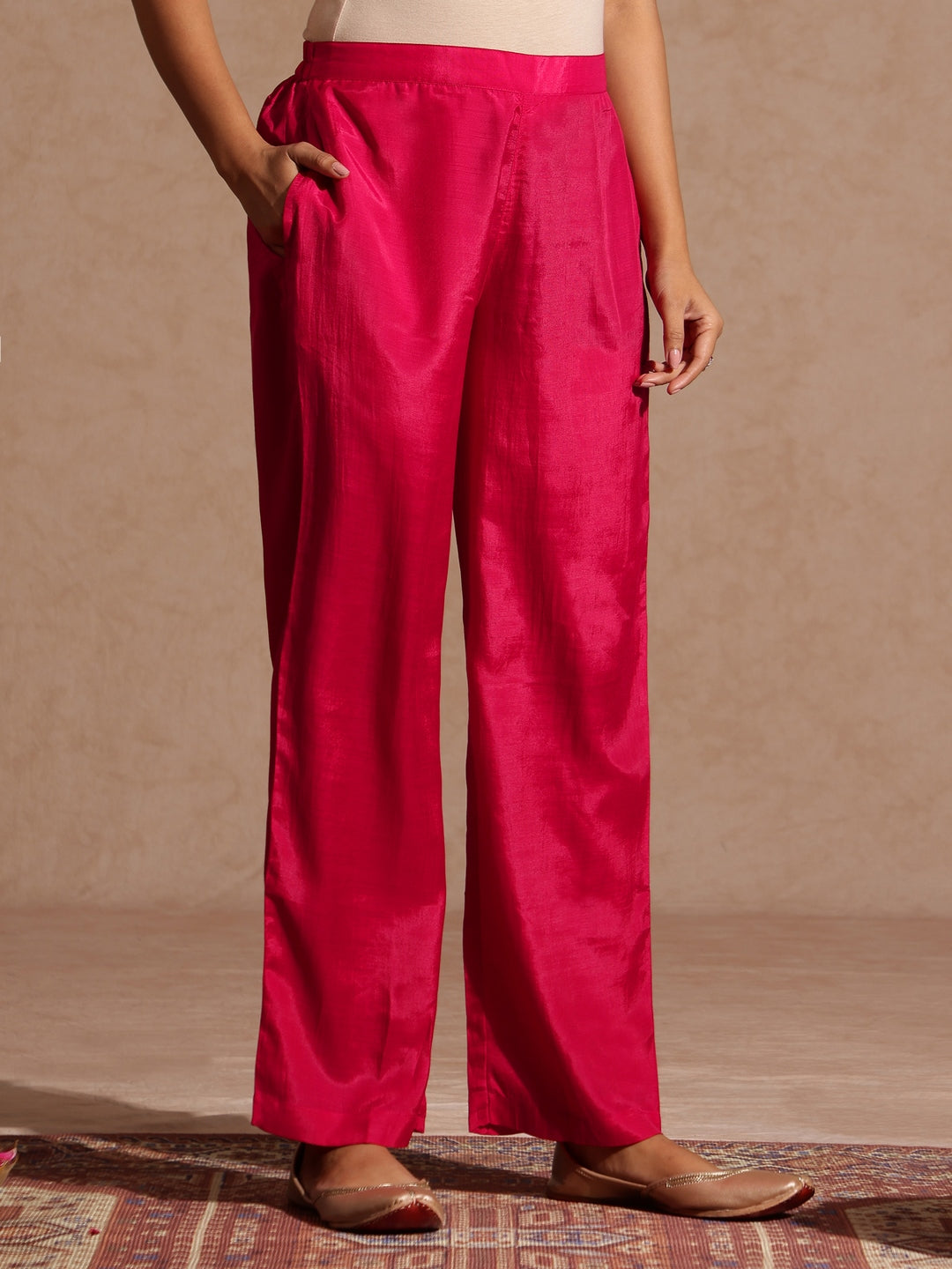 - Step into elegance with Janasya’s vibrant pink silk blend kurta set, designed to make every moment festive-ready. This straight-fit kurta features intricate thread and zari embroidery with shimmering sequins floral motifs, thoughtfully placed along the v-neckline, chest, and floral motif embroidery scattered across the front for a balanced festive charm. The three-quarter sleeves are adorned with delicate golden lace on the cuffs, echoing the gota patti lace accents on the matching silk blend dupatta. The calf-length kurta is lined with soft crepe fabric for all-day comfort and a premium finish. It pairs perfectly with a straight solid pink pant featuring a semi-elasticated waistband and a practical side pocket. For an elevated ethnic ensemble, accessorize with statement jhumkas, stacked bangles, and embroidered juttis. Whether it’s a family get-together or a festive celebration, this look offers a luxurious yet effortless vibe.