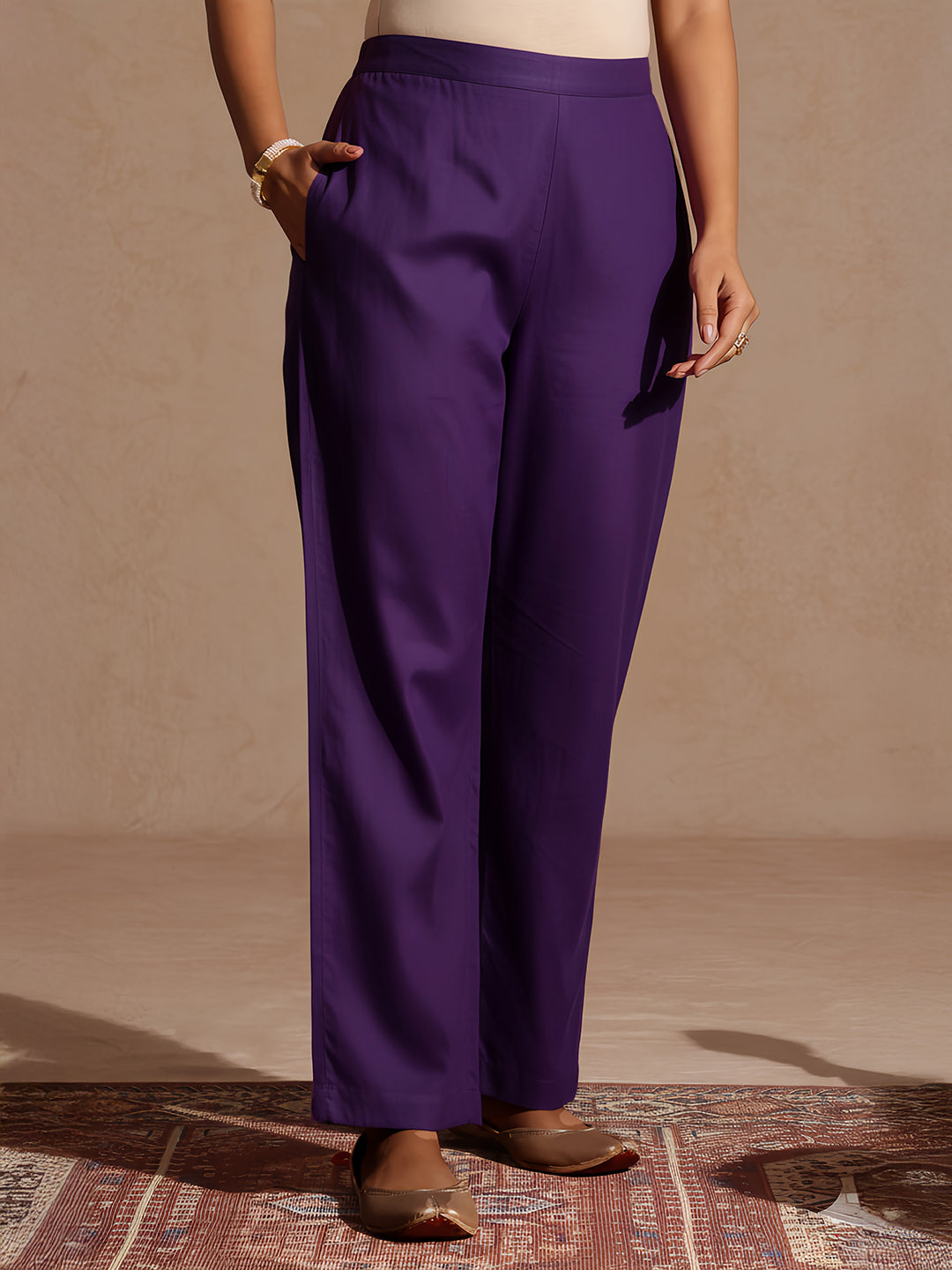 - Immerse yourself in timeless elegance with this purple silk blend kurta set from janasya, crafted for refined festive moments. The straight-cut kurta is elevated with intricate thread and zari embroidery, accentuated by delicate sequins. Vertical floral embroidery lines the front, while the neckline is beautifully shaped in a v with ornate detailing. The three-quarter sleeves are adorned with lace trims, and the kurta is fully lined with crepe fabric for enhanced comfort. It is paired with solid purple straight pants featuring a convenient side pocket with semi elasticated waist for ease of wearing. The matching silk blend dupatta adds a graceful touch, finished with lace borders that subtly complete the ensemble. Pair it with pearl-studded flats, a sleek gold bangle stack, and chandelier earrings to amplify the regal charm. A soft bun and a pastel clutch can complete your look for weddings, receptions, or festive evenings.