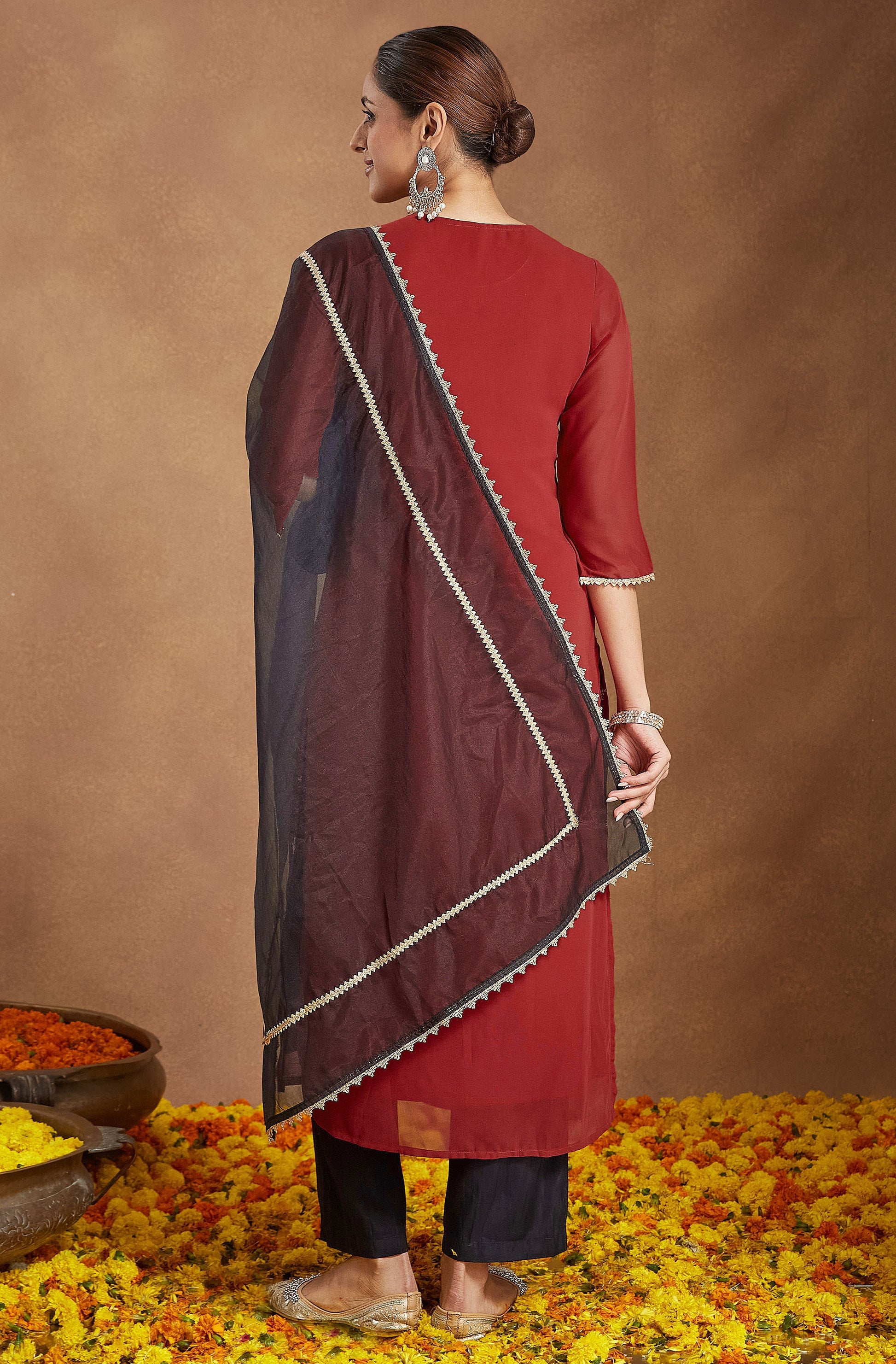 - Kurta Color : Red | Pant Color : Black | Dupatta Color : Black