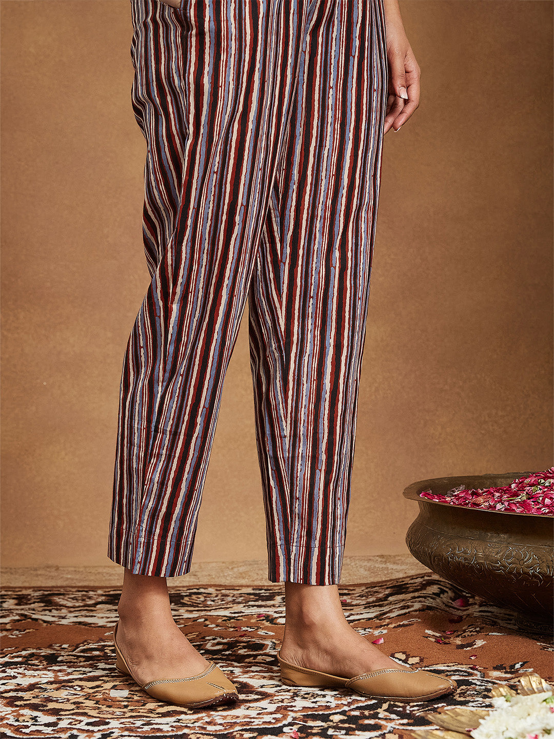 - Step out in timeless elegance with this rust pure cotton straight kurta set from Janasya, designed to blend tradition with effortless style. The kurta showcases a beautiful all-over floral print, highlighted with a flattering v-neckline detailed with patchwork and delicate silver gota patti lace for a refined festive charm. Its calf-length silhouette with 3/4th sleeves, finished with patchwork and lace trims on the hem, adds subtle sophistication. Paired with a narrow-striped printed cotton pant featuring a side slit, semi-elasticated waistband, and a functional pocket, it offers both comfort and practicality. A coordinating rust mull dupatta, adorned with floral prints and lace trimming, completes the ensemble, making it a versatile choice for both festive gatherings and casual outings.