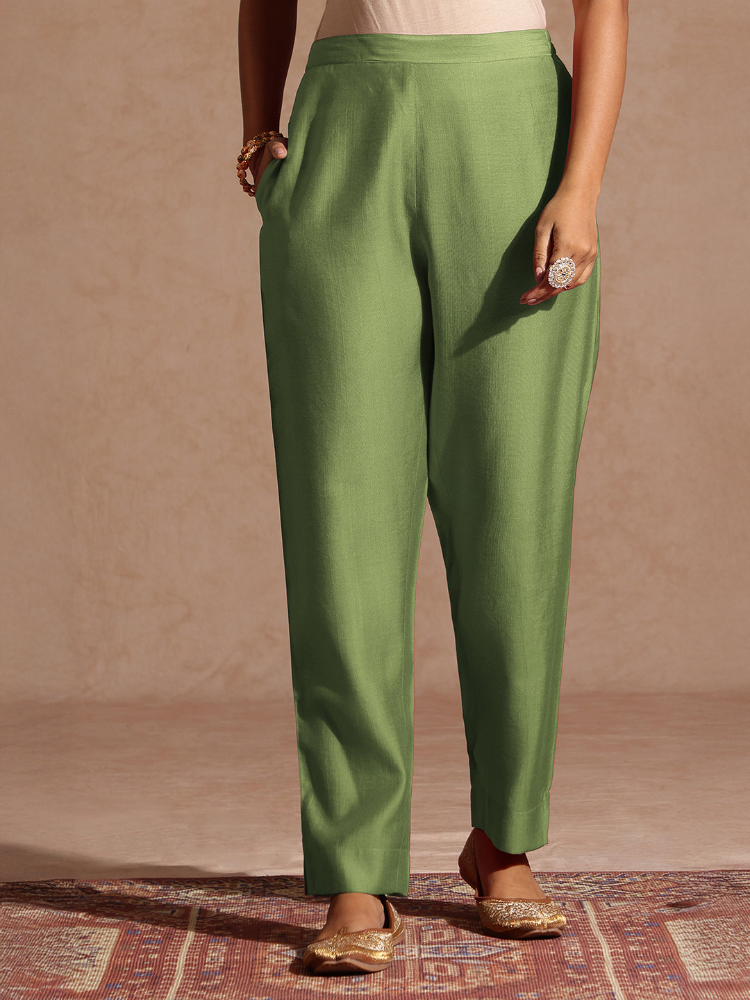 - Radiate timeless grace with this stunning sage green green silk blend straight kurta set from janasya. The kurta features an elegant round neckline adorned with intricate gold zari embroidery on the yoke, further highlighted with delicate gold sequins that lend a subtle shimmer. The embroidery is beautifully framed with a matching gota lace border, adding to its refined charm. The three-quarter sleeves are finished with dainty lace detailing for a polished touch. It comes with a solid sage green narrow pant featuring a semi-elasticated waist, mid-rise fit, and side pocket for comfort. Completing the look is a rich jacquard dupatta embellished with gold zari motifs. Pair this ensemble with traditional gold jhumkas and bangles for a radiant festive appeal.