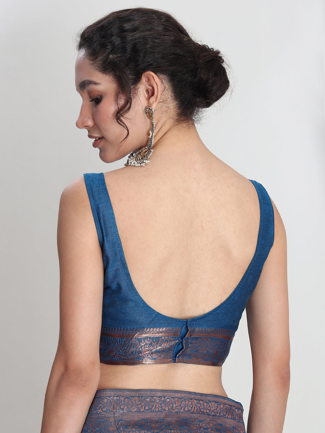 - Radiate understated elegance with this teal blue silk blend jacquard saree, adorned with a beautifully woven floral pattern that adds depth and charm. The rich texture of the silk blend ensures a graceful drape, while the golden zari border enhances its timeless appeal with a touch of opulence. Lightweight yet sophisticated, this saree is perfect for festive gatherings, celebrations, and special occasions. Pair it with a matching blouse and minimal jewellery for a refined and effortlessly chic look.