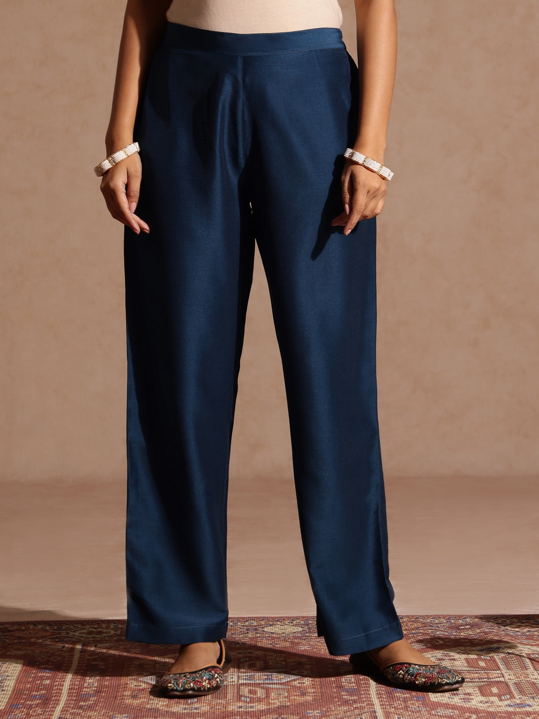 - Bring an ethnic charm to your wardrobe with this stunning teal blue anarkali suit set from Janasya. Crafted in rich muslin fabric, the kurta features intricate embroidery with sequins and zari at the yoke, beautifully enhancing its notch neckline. The body of the kurta showcases elegant foil prints all over, adding a festive shimmer. Designed for comfort and style, it has three-quarter sleeves with golden lace at the hem, a side pocket, and a flattering flare. The kurta is paired with solid teal muslin straight pants that complement its rich tone. Completing the ensemble is a chiffon dupatta adorned with a delicate golden lace border that adds a touch of elegance. Pair this ensemble with statement jhumkas, metallic heels, and a box clutch for weddings or festive gatherings.