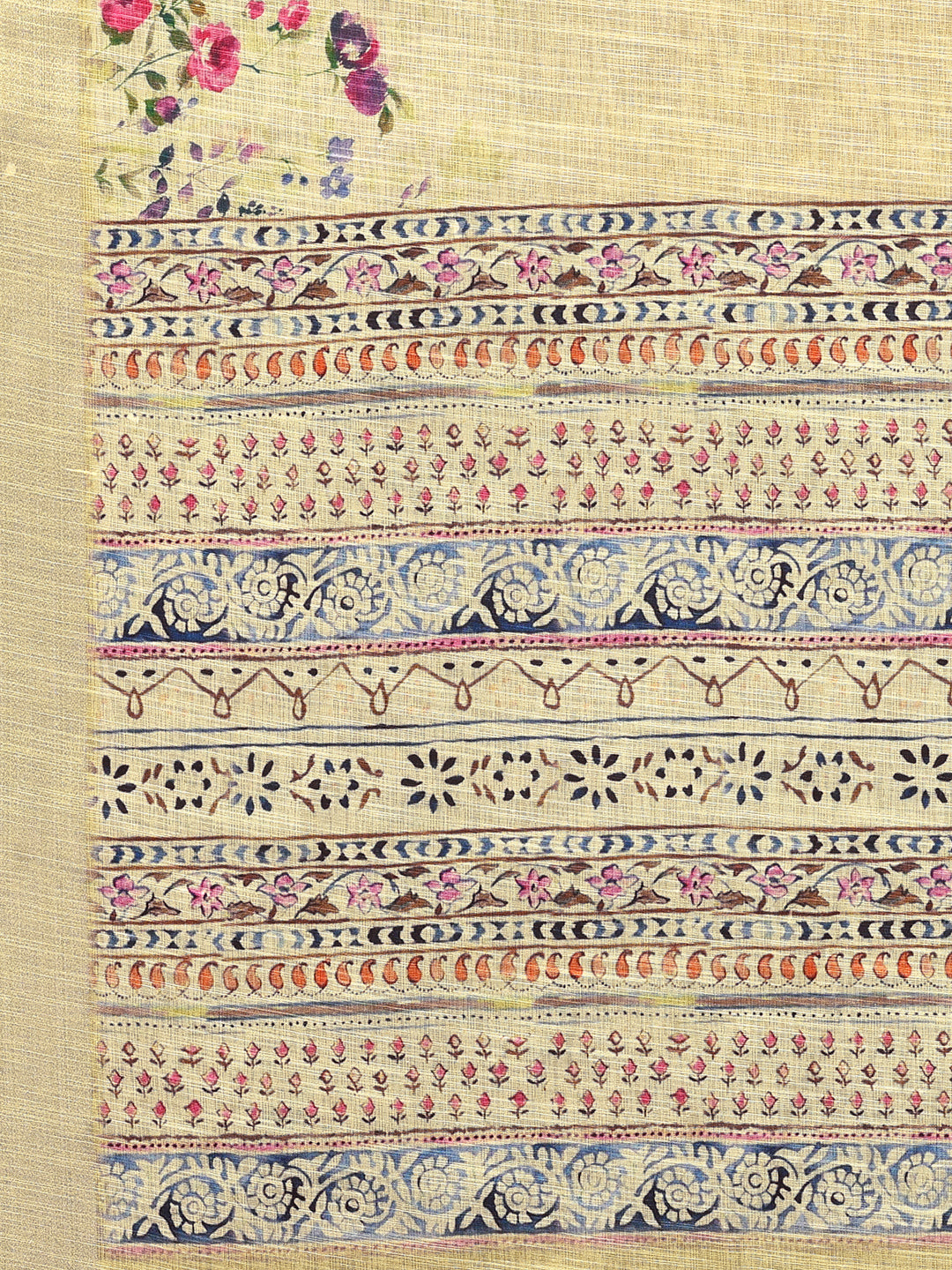 Light Yellow Linen Blend Floral Printed Daily Wear Saree with Blouse Piece