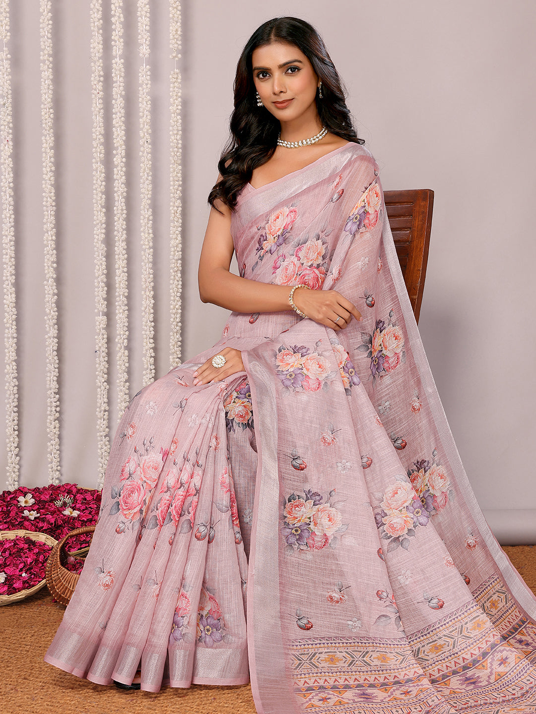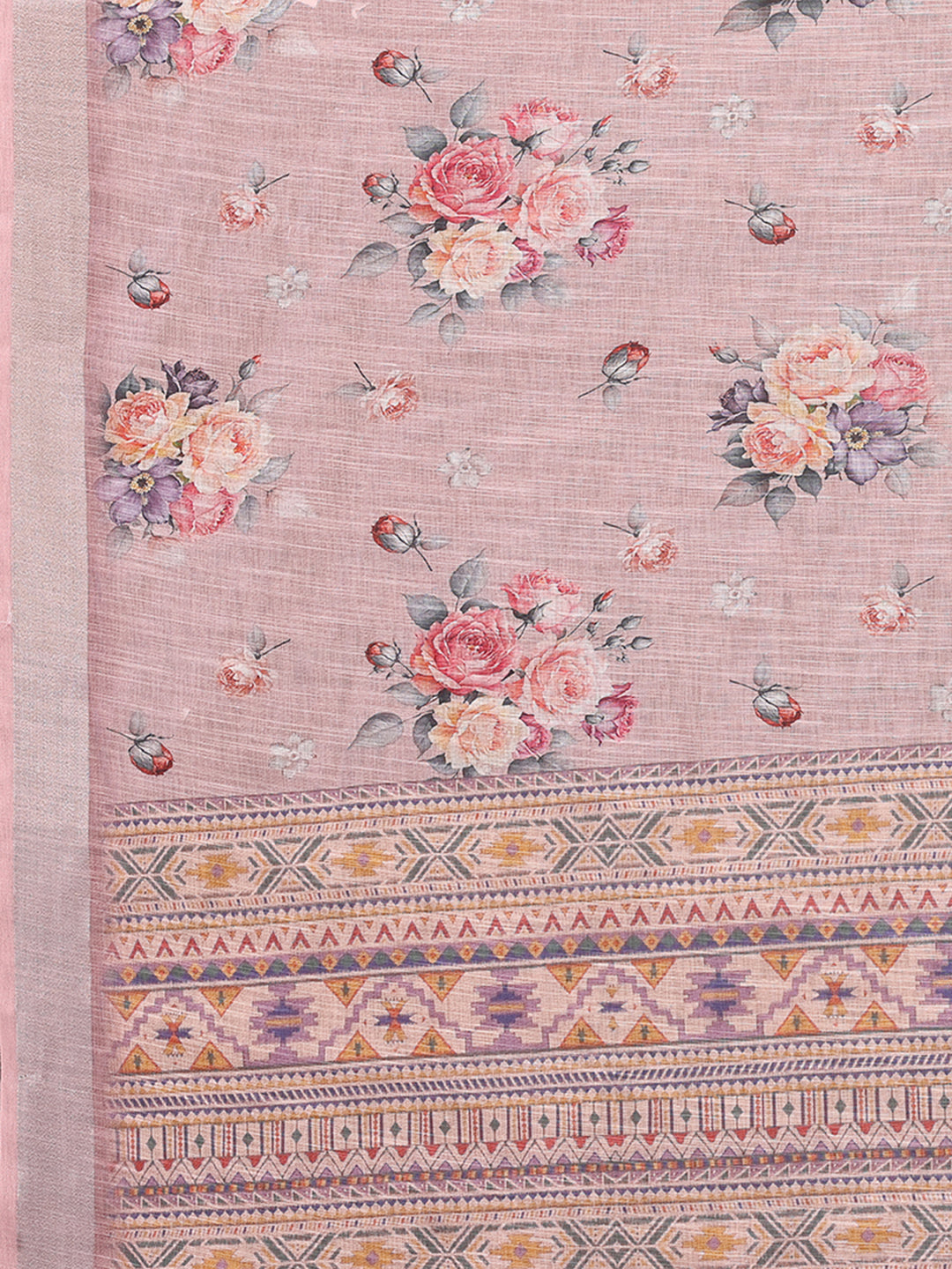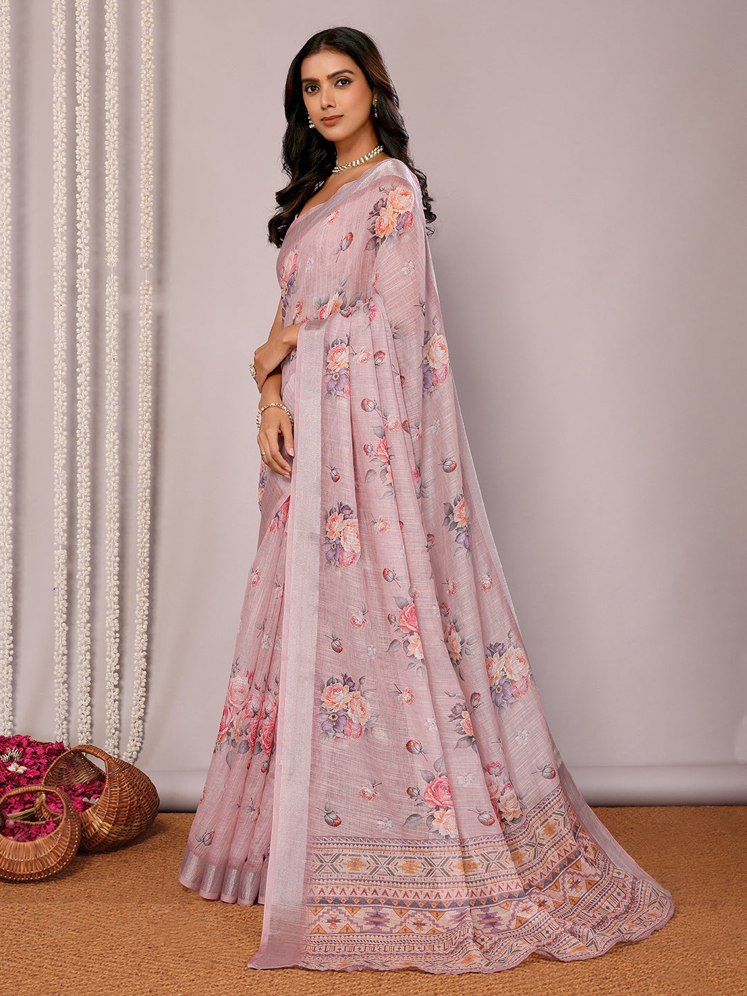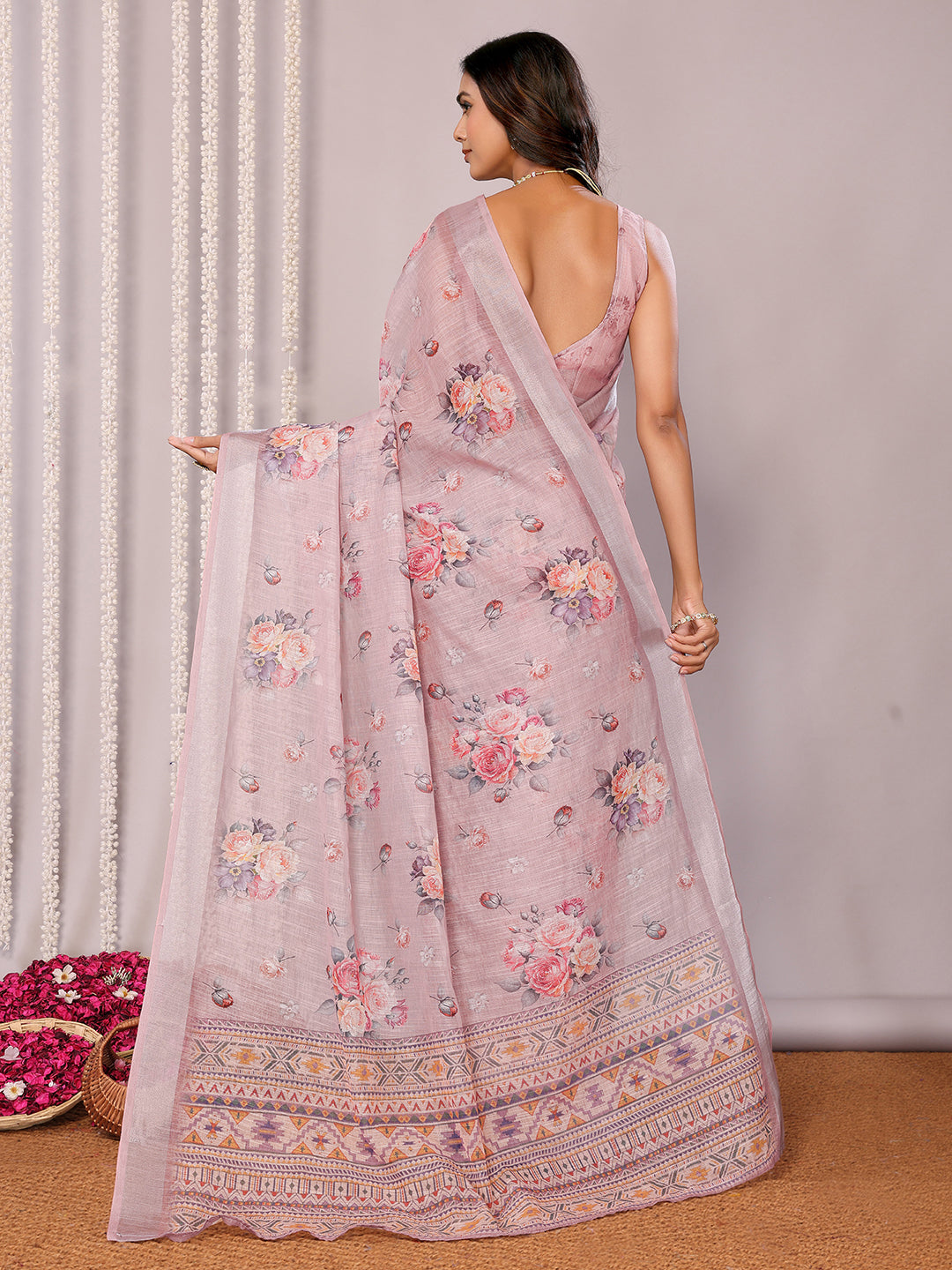 Mauve Linen Blend Floral Printed Daily Wear Saree with Blouse Piece