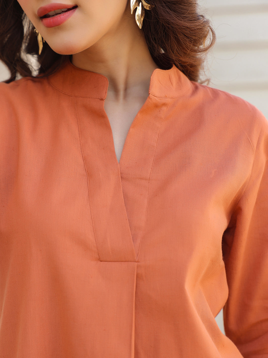 - This rust flex cotton a-line co-ord set is the model of effortless style. The top features a sleek band collar with a v-neck and a single pleat under the yoke, offering a refined yet relaxed look. With a side pocket, this set combines simplicity with class. The matching straight pants complete the ensemble, making it perfect for casual outings. Versatile and comfortable, this co-ord set is a must-have addition to your wardrobe.